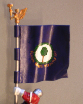The banner echos the dark blue background of the Union Jack. The center is a tree within a circle of laurels. This banner's motto is "gloria umbra virtutis est" - glory is the shade of courage/bravery.
