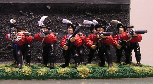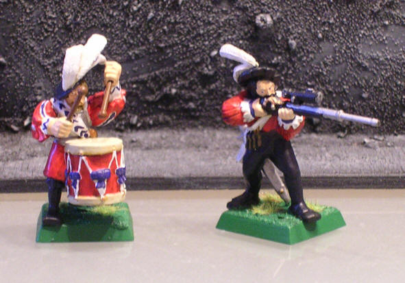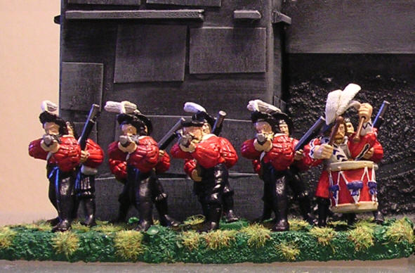This unit consist of 20 musketeers or handgunners. One of them is a marksman with a Hochland long rifle, another one is a musician. For the Hochland long rifle I stretched a regular musket and added a telescope out of my bits box. Again this unit follows the colours of the British army of the 17th and 18th century. The musician is wearing a complex variant of the regiments uniform.